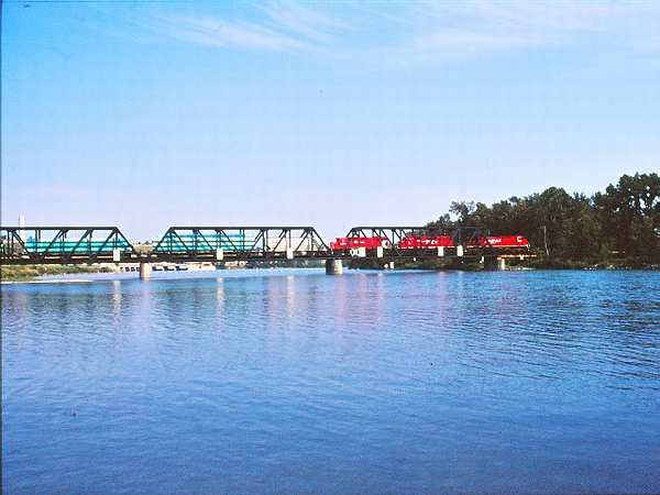 ![]() | The CPR Bridge spanning the Bow River in Calgary between Alyth Yard (12th STREET EAST), Mileage 0.0 and BENGAL, Mileage 1.1 on the Red Deer Subdivision. The train is inbound for Alyth and the view looks east along the Bow River from an area behind the Calgary Zoo in the early 2000s. Bengal is roughly situated below the Calgary Herald Building to the east, or the Telus Spark science centre to the west. Access my bridge page for several photos of a round culvert train tunnel there. |