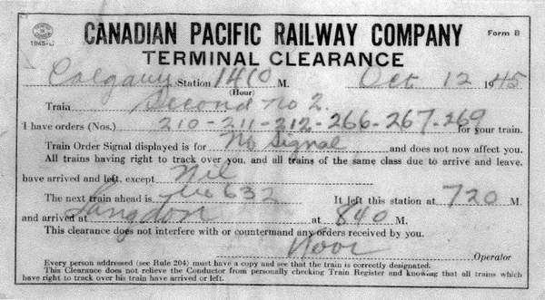 Train orders were given to the conductor, and the trainman and they indicated to him which route to follow, when to arrive where or wait in sidings etc and what other trains he expected to meet on the way. Usually yellow (sometimes green depending on the railway) they were called “flimsies” because they were printed on very flimsy paper, rolled up either put into a hoop or on a “Y” wood arrangement which had a string across (lige a slingshot with a string across the top. There were 2 choices: Either the conductor read the flimsies at the station (at larger stations) and passed the information to the engineer and the brakeman or the flimsies were picked up on the fly at the smaller stations. In this case the stationmaster stood on the platform, held the Y gizmo high and, as the train went by, the fireman put his arm through the Y gizmo, grabbing the flimsy attached looely by the cord and threw the y gizmo further up the track, as the train kept its speed. The fireman then read the train order to the engineer and the information was then relayed to the conductor and the brakeman (On passenger trains, the trainman wes the brakeman) The pecking order was as follows” Operating Crew: Engineer (driver) Fireman (brakeman) Non-op: Conductor (looked after the tickets and the operation but didn’t drive it) Gold buttons and gold “conductor” designation on his hat. Trainman (looked after the steam, electrics etc on passenger trains). He was also the brakeman and his job was to go a mile back in case of emergency and put up some flares. What is shown here are 3 types of train orders here, one is a clearance to proceed, the others are flimsies. For more information of Train Orders please go to this page. http://www.greenbayroute.com/trainorders.htm#end |